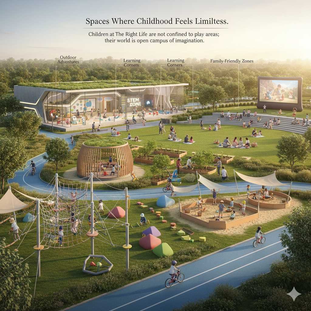 The community has multiple family lawns and amphitheater lawns where evening storytelling, movie nights, and community picnics take place — ensuring that weekends belong to togetherness, not screens.
