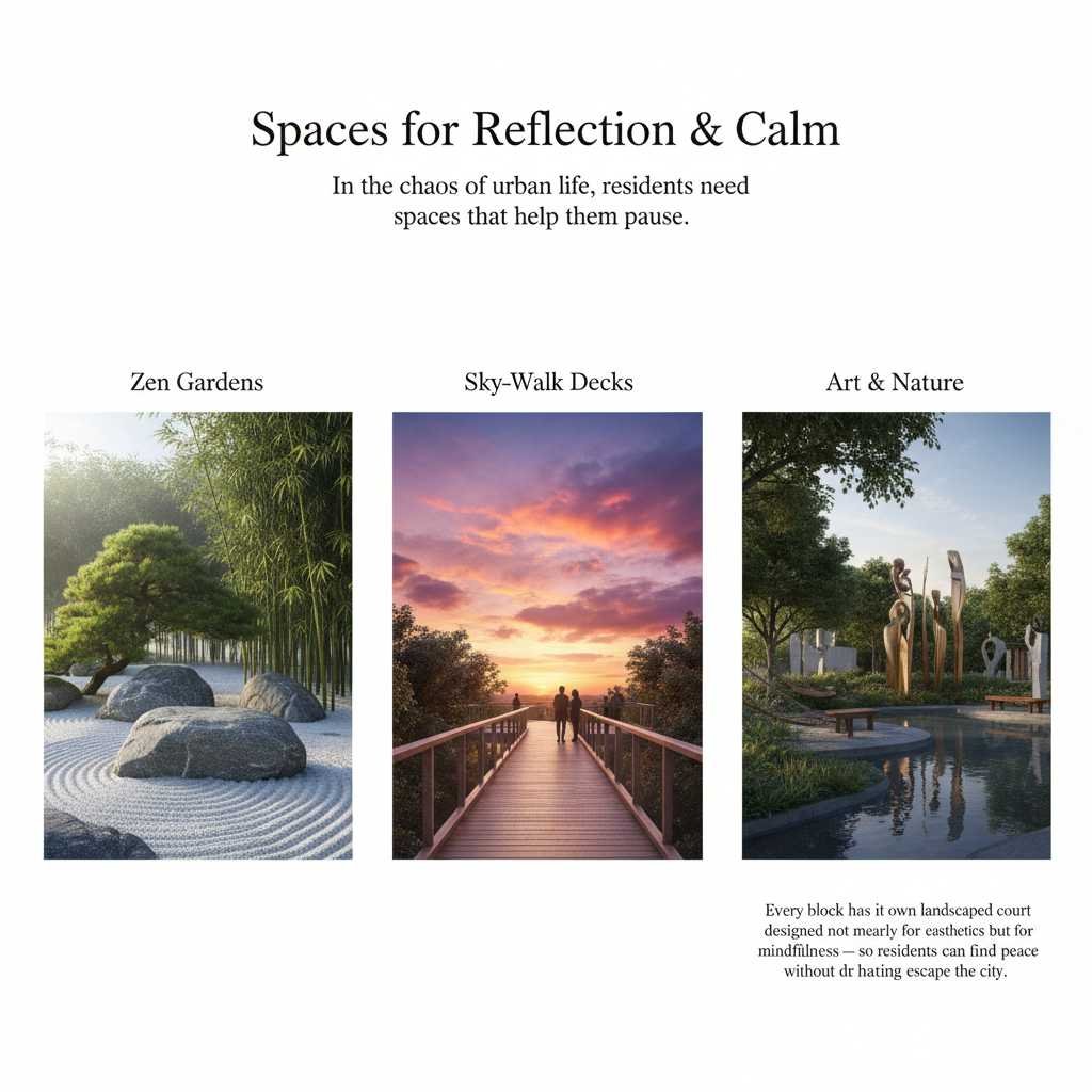 Every block has its own landscaped court designed not merely for aesthetics but for mindfulness — so residents can find peace without having to escape the city.