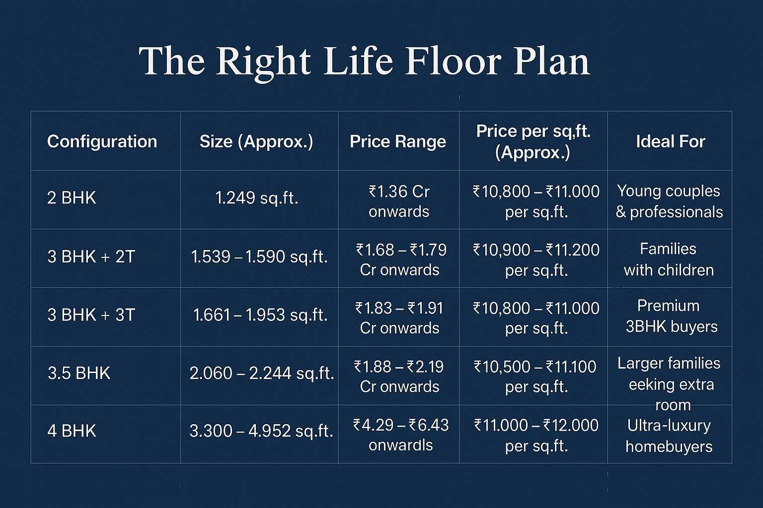 The Right Life offers a wide range of beautifully designed apartments that cater to different family sizes and lifestyle needs. The project features 2 BHK, 3 BHK, and 4 BHK homes that come with spacious layouts, smart planning, and excellent cross-ventilation. Each floor plan has been designed to provide maximum space utilization while ensuring privacy and natural light in every corner of the house.