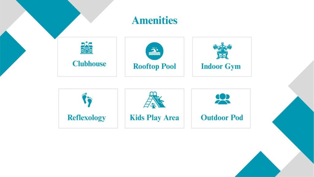 The grand clubhouse serves as the social heart of the community, featuring multipurpose halls, a fitness centre, indoor games, and a dedicated yoga studio. Residents can unwind at the swimming pool, enjoy evening walks on the jogging track, or engage in outdoor sports within lush landscaped surroundings.